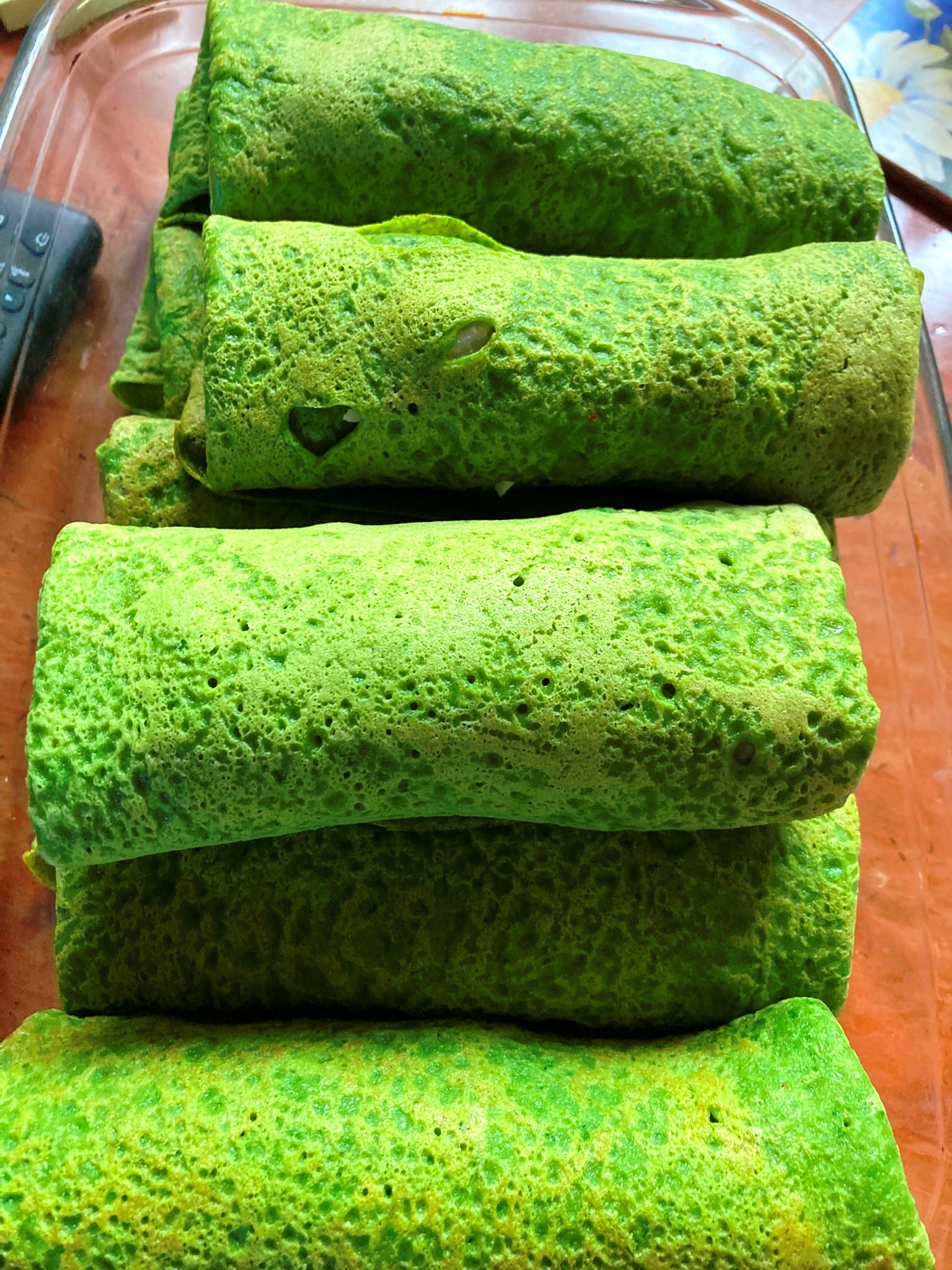 Spinach pancakes stuffed with egg, rice and spring onion