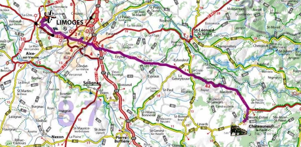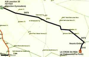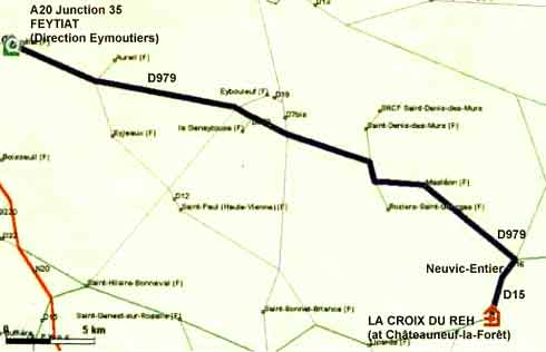 Leave the A20 at Feytiat, Junction 35, direction Eymoutiers. Follow the D979 until shortly after Masléon, turning right to join the D15 at Neuvic-Entier.